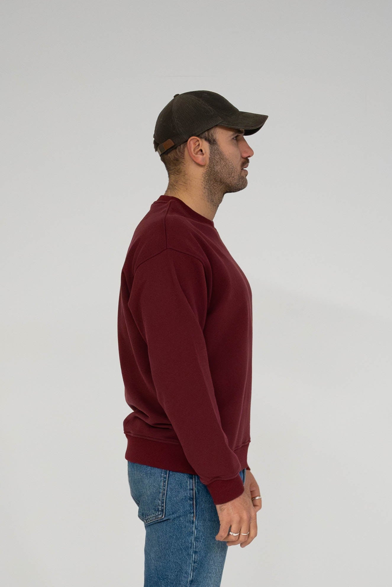 Unisex sweater, with a round neckline and long sleeves. Its oversized shape adapts to all body types with ribs on the neck, sleeves and waistband. Burgundy color with the logo embroidered on the chest on the left, in the color of the piece. Produced with 70% cotton and 30% polyester. The seam taping detail on the neckline highlights the brand's individuality, present in all the pieces. Designed and produced ethically in Portugal.