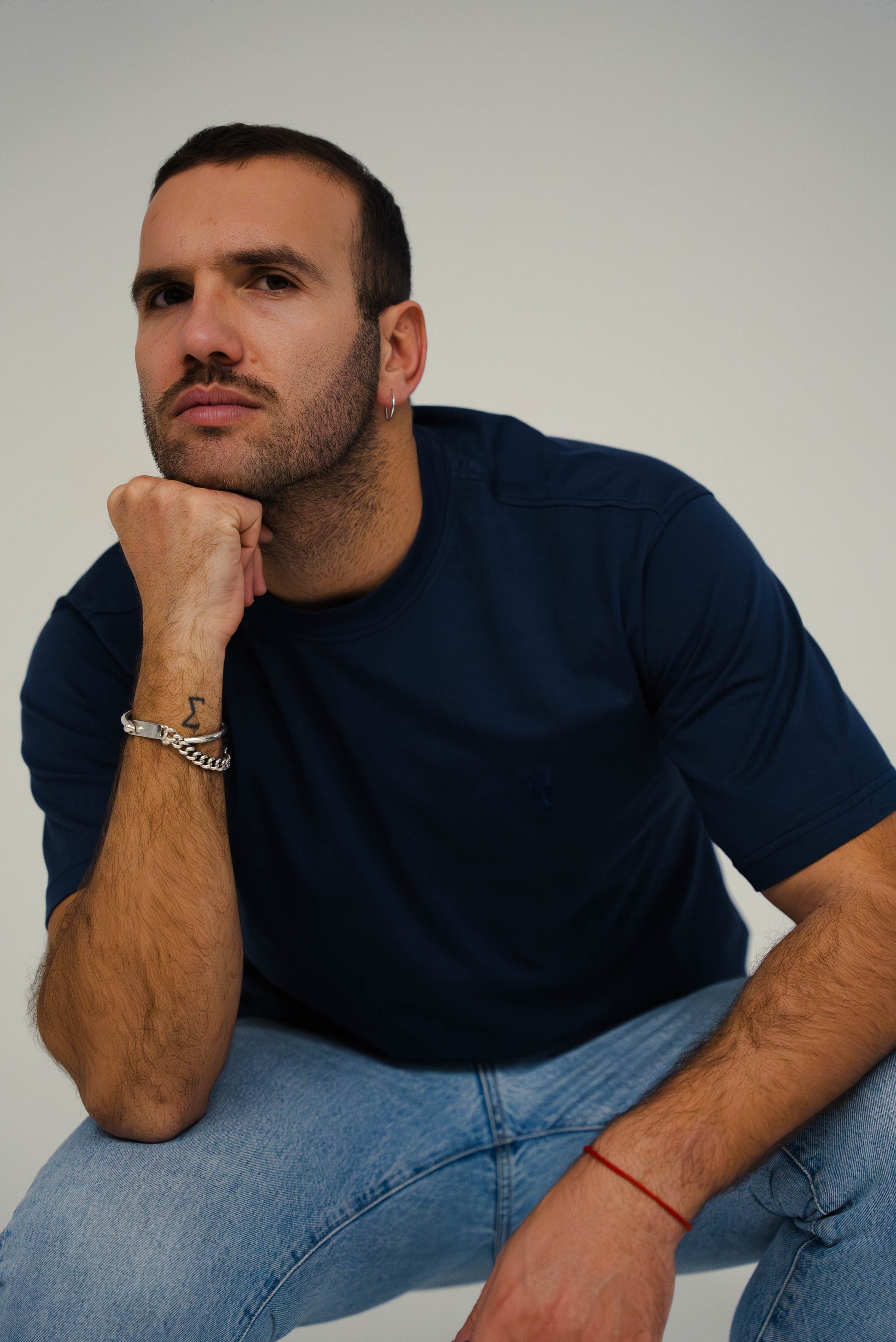 Unisex t-shirt, 100% cotton with a soft texture. Navy blue color. Oversized model, versatile in any look. Round neckline in ribbed knit, short sleeves. Lobster embroidery on the left side of the chest, in the color of the piece. The detail of the seam cover on the neckline highlights the brand's individuality, present in all pieces. Designed and produced ethically in Portugal.