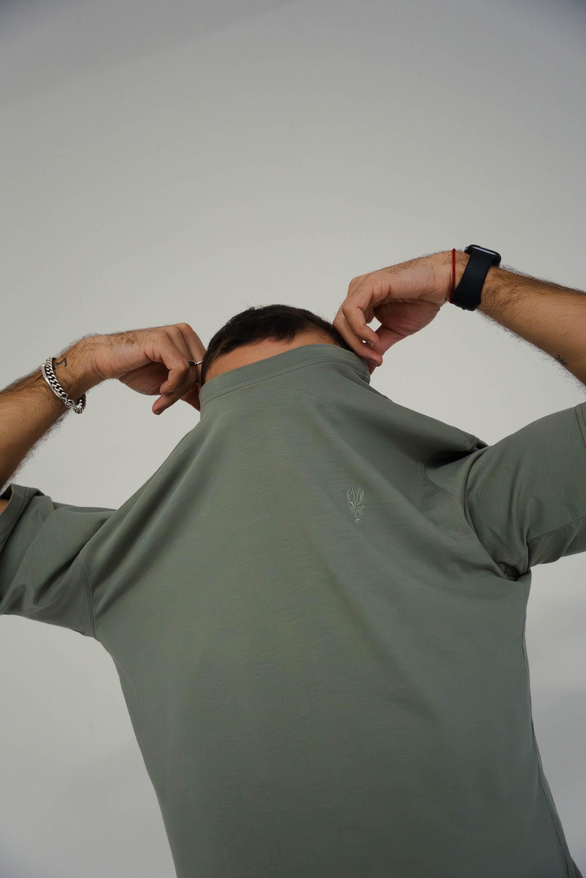 Unisex t-shirt, 100% cotton with a soft texture. Khaki green color. Oversized model, versatile in any look. Round neckline in ribbed knit, short sleeves. Lobster embroidery on the left side of the chest, in the color of the piece. The seam taping detail on the neckline highlights the brand's individuality, present in all the pieces. Designed and produced ethically in Portugal.